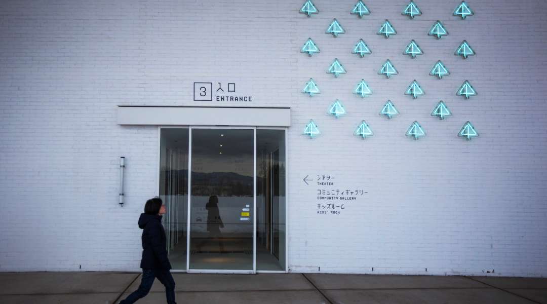 The entrance to Aomori Museum of Art illuminated by artful neon tree designs © Aomori prefecture