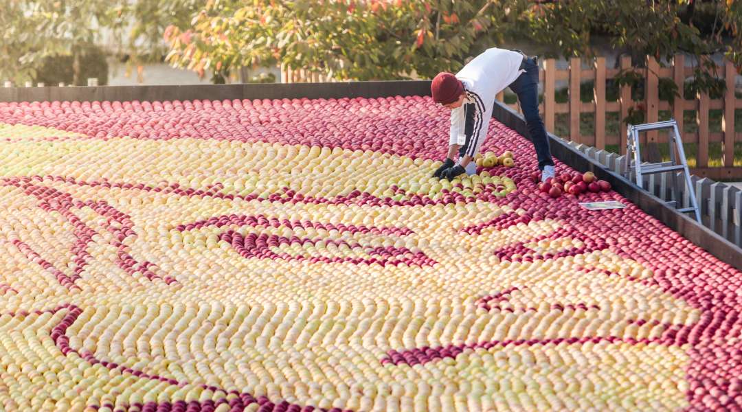 An apple artist arranging Hirosaki's famous green and red apples into a collage of a samurai © Aomori prefecture