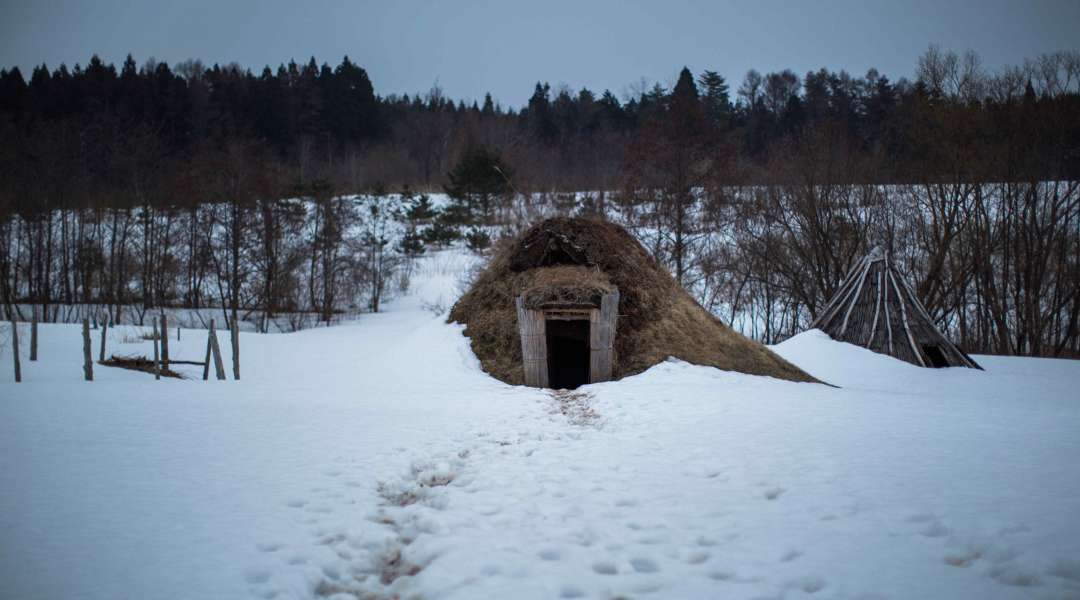 Footsteps in the snow lead toward a historic Jomon-style thatched hut © Aomori prefecture