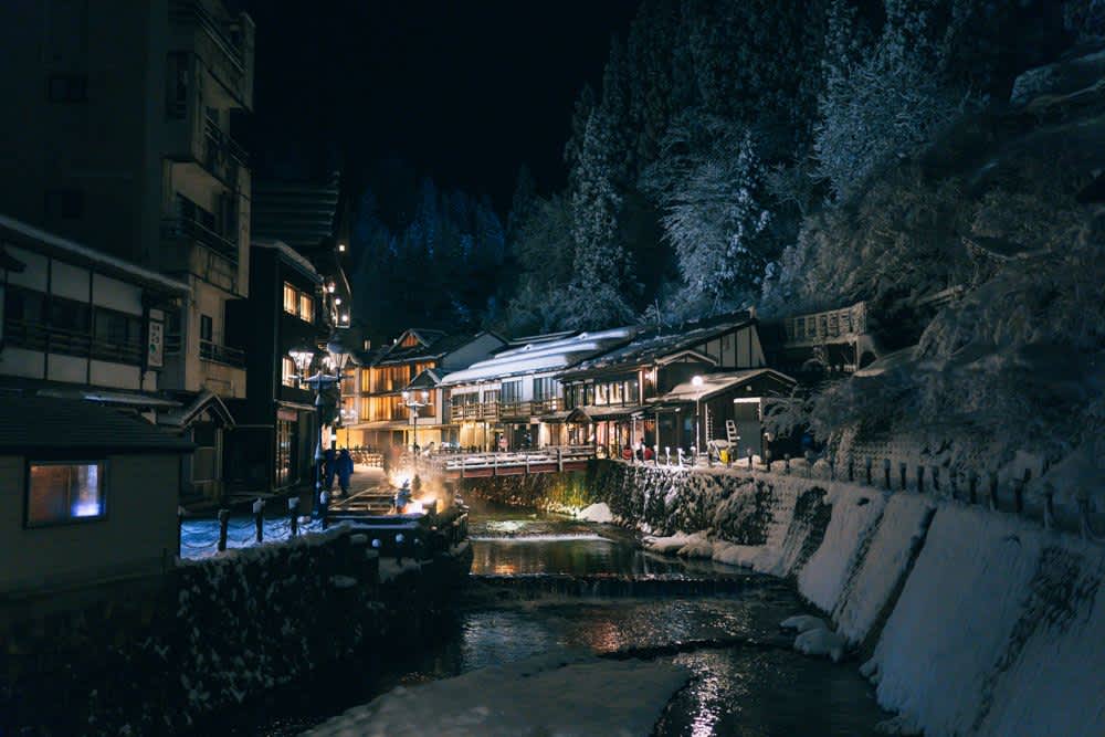 Due to the narrow, historical streets and the absence of parking spaces, Ginzan Onsen’s town centre is a pedestrian-only zone. At night, the ryokan lining the riverbanks are lit up and the town’s bridges and street corners are illuminated by gaslight, turning the town centre into a veritable haven for strollers. In summer, staying ryokan guests clad in colourful yukata can be seen out and about taking the air, while in winter the townscape is accentuated by the layers of heavy snow that cling to its rooftops and walkways.