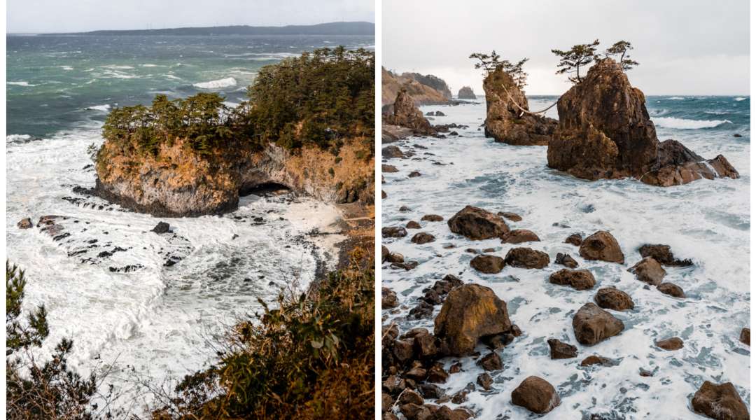 On the left: Ganmon Sea Cave; on the right: Hatago Iwa Married Rocks