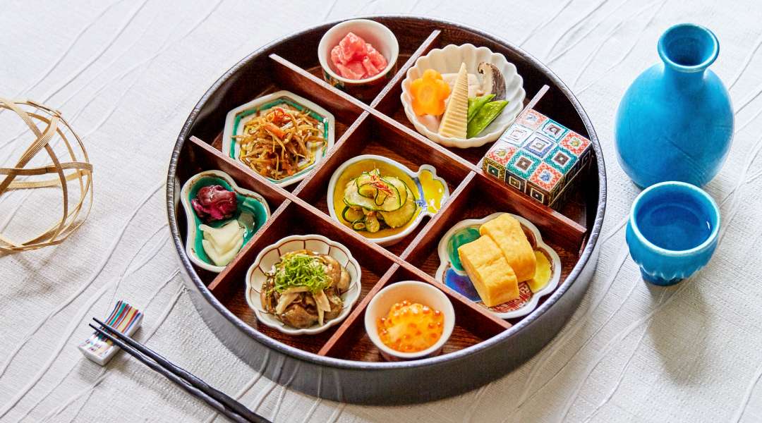 This bento lunch box made of Yamanaka Lacquerware, a traditional lacquerware made in Ishikawa Prefecture, is set with cute and bright small plates and bowls made of Kutani ware which is also a product of Ishikawa Prefecture. With this bento box, you can recreate the serving style often seen in Japanese restaurants at your own home. Filled with small snacks, it’s all you need to drink sake in style.