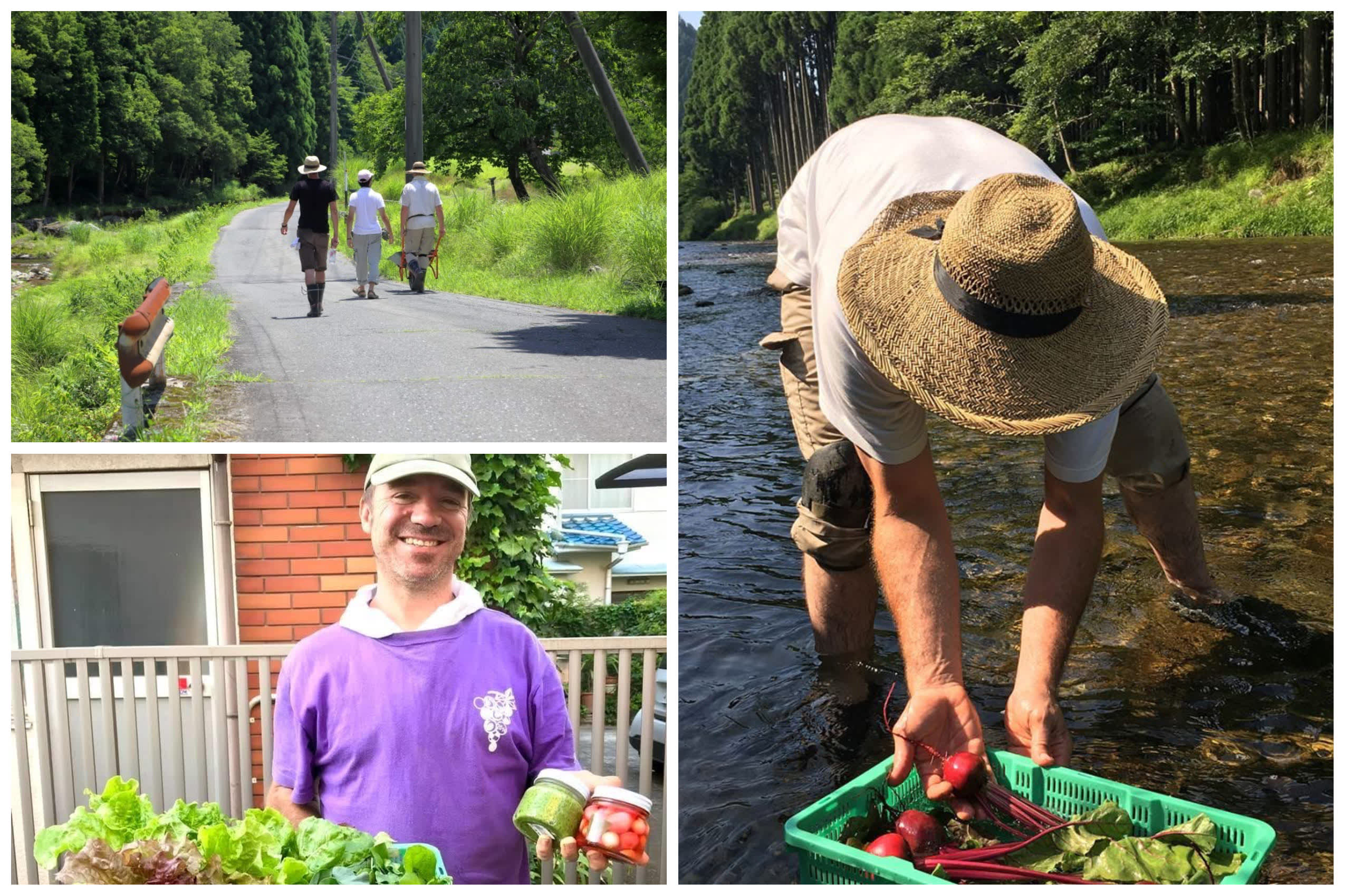 Top left: walking to the field; bottom left: Chuck with his produce; right: washing beetroots in the river
