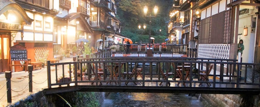 Nestled by the Ginzan River in Yamagata lies the “Silver Mountain” hot spring town, named after the silver mine discovered about 500 years ago. The Ginzan hot springs run with steaming translucent waters that add to the town’s rustic atmosphere. With traditional wooden inns on both sides of the Ginzan River, the tradition of Japanese culture and hospitality can be enjoyed in the resort. The Ginzan area is home to the Kaminohata-yaki pottery, which creates a remarkably gorgeous dark blue porcelain. The craft is unique to the Ginzan Hot Spring with roots from 1831.