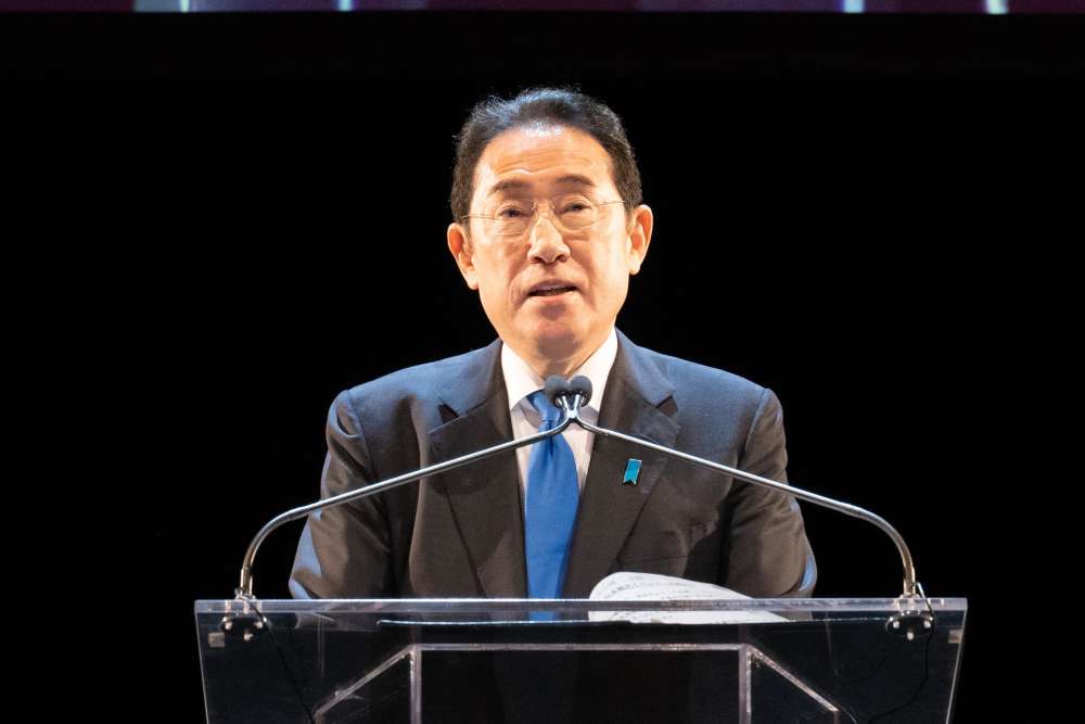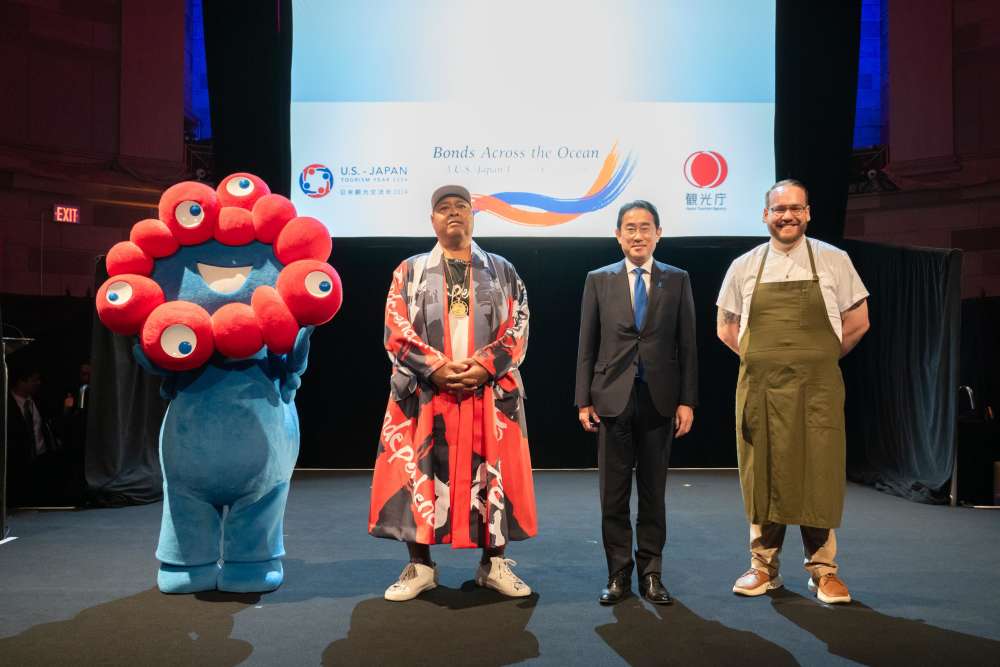 Osaka Expo 2025's mascot Myaku-Myaku, Sumo wrestler Yasokichi Konishiki, Prime Minister Fumio Kishida and Chef Samuel Clonts ©Japan Tourism Agency