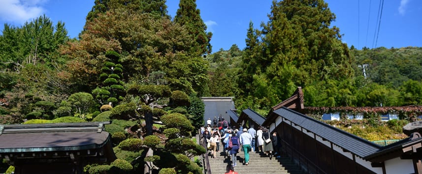 Yamadera’s namesake literally means “Mountain Temple,” but is also known as Risshaku-ji, founded in 860 AD as a Tendai sect temple of Buddhism. A hidden gem off the beaten path, Yamadera has a treasure house with several important cultural assets. The mountain temple’s natural surrounding is a national Place of Scenic Beauty and a Historic Site. Recognized as one of the 100 Soundscapes of Japan, Yamadera’s cicadas were written about in a famous haiku by Matsuo Basho in 1689. The pathway to the temple itself is surrounded by a dense cedar thicket with a ten thousand-step climb. Established on a steep hillside, the temple offers a picturesque view at the top of the temple.