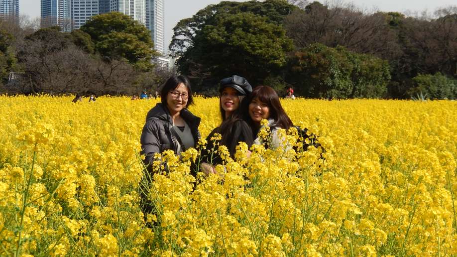 Tonalidades amarillas cubren cada año los jardines de Hamarikyū, en Tokio, que se llenan de paseantes que acuden a contemplar las más de 300.000 flores de colza que conviven con los ciruelos en flor en medio de un paisaje flanqueado por rascacielos.
