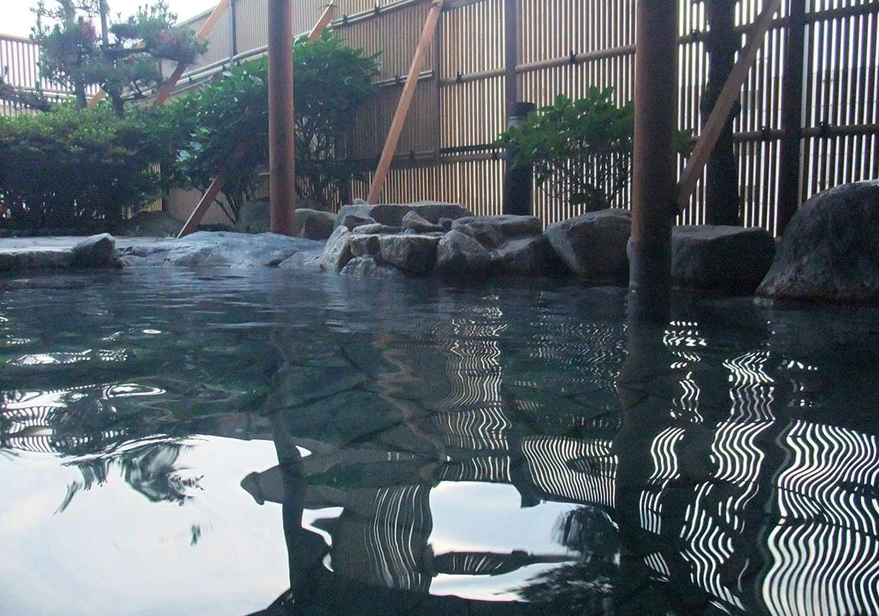 Una auténtica fuente termal japonesa, con vapor ascendente y olor a azufre flotando en el aire.