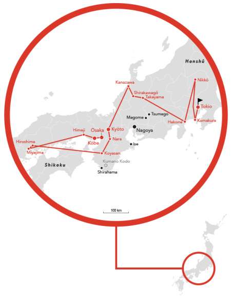Tokio • Kamakura • Nikko • Hakone • Takayama • Shirakawa-go • Kanazawa • Kyoto • Nara • Koyasan • Hiroshima + Miyajima • Himeji • Kobe • Osaka