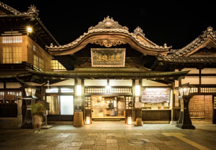Dogo Onsen se encuentra a unos 40 minutos en tren y autobús desde la estación JR Matsuyama. Es un lugar famoso por ser la localización de Botchan, la novela de Soseki Natsume, así como uno de los "Abura Ya" que aparece en la película El viaje de Chihiro. También se dice que es la fuente termal más antigua de Japón y ya aparece mencionado en importantes fuentes de la literatura japonesa como en Nihon Shoki y El cuento de Genji.