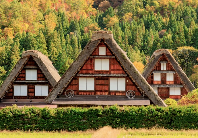 Shirakawago es un pueblo famoso por sus construcciones tejados a dos aguas muy empinados, registrado como Patrimonio de la Humanidad. Se tarda en llegar aproximadamente 3 horas en autobús desde la estación JR Nagoya y 1 hora y 30 minutos en autobús desde la estación JR Kanazawa. Actualmente pueden verse más de 100 casas designadas como edificios tradicionales.