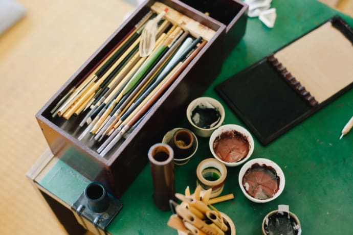 Li: Algunas de estas herramientas están hechas de cosas extrañas. Hay un cepillo que está hecho con cabello de buzos de conchas. Herramientas como esta son realmente caras y cada vez hay menos personas que las fabrican. El mantenimiento diario, para mantener sus herramientas en buenas condiciones, es parte del trabajo.