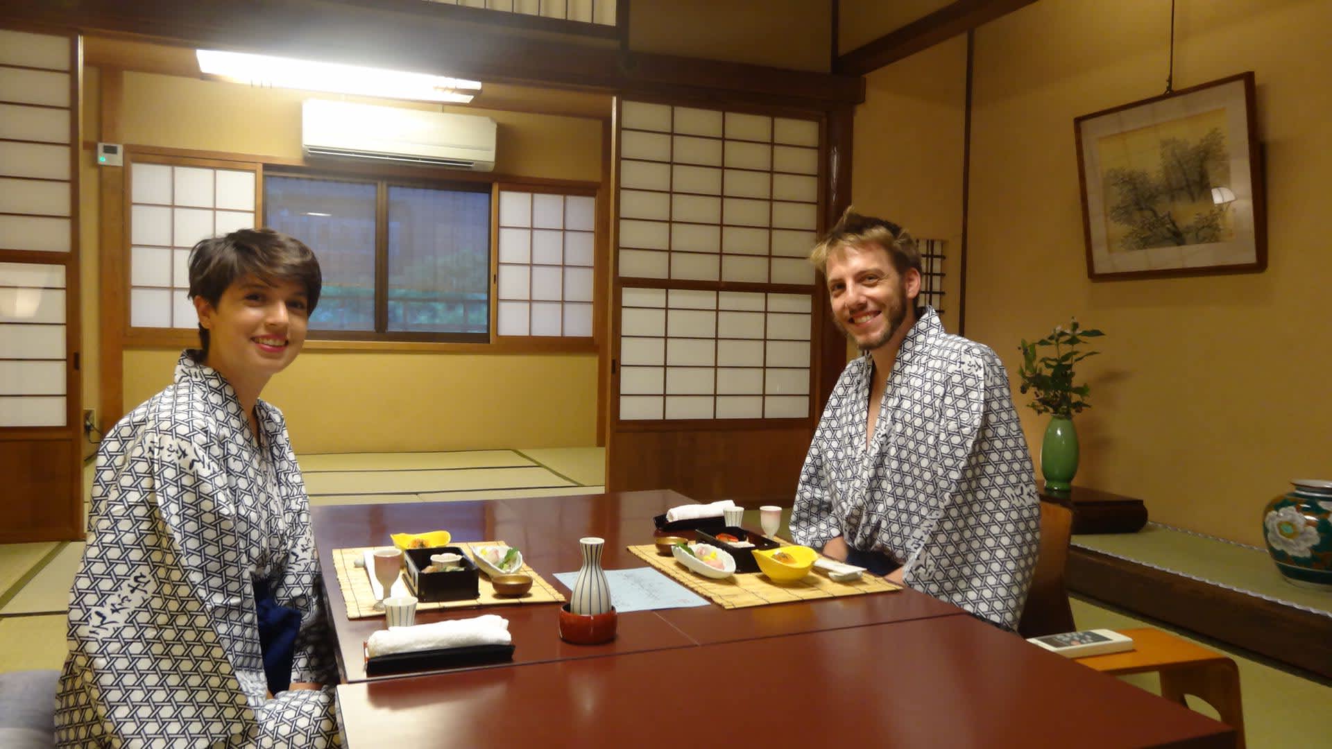 La cena la degustaban en la habitación vestidos de yukata, una especie de kimono. ¡El personal de hotel les ayudó a ponérselo y les hicieron algunas fotografías para que tuvieran de recuerdo! La cena recuerdan que fue espectacular, un curso de más de quince platos de cocina local, que venía incluido con la estancia. ¡De lo mejor del viaje!