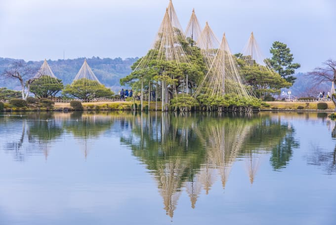 El jardín Kenrokuen del siglo XVII, considerado uno de los tres mejores jardines paisajísticos del país, es uno de los platos fuertes de cualquier visita a Kanazawa . El jardín fue diseñado para ser hermoso en cualquier estación, pero es particularmente popular en mayo, con iris florecientes, y en invierno, cuando las estructuras yuki-tsuri de bambú protegen los pinos del peso de la nieve.