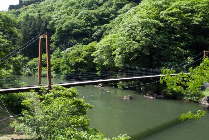 Corriente arriba hay otro puente pequeño desde el que podrás volver cruzando el río. En el pueblo puedes tomar un autobús. Pasado el puente colgante te esperan las aguas termales en un rotenburo con vistas al río.
