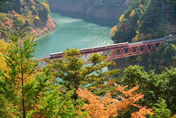Puedes disfrutar de la belleza de Okuoi tomando la línea Ikawa, el único ferrocarril de cremallera del país. Esta línea te lleva entre las montañas y al otro lado del puente de Sekinosawa.
