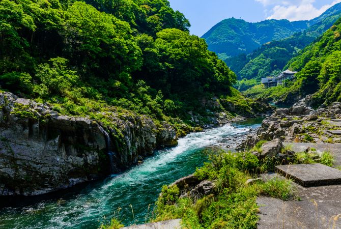 Si deseas disfrutar de una naturaleza exuberante y hacer rafting en aguas bravas, acércate a los valles de Tokushima. Si te apetece algo más tranquilo, haz una excursión en barco desde el valle de Oboke hasta el de Koboke y disfruta de las aguas azules y las extraordinarias formaciones rocosas. En esta zona también se encuentra la «aldea de los muñecos». Visítala para ver sus habitantes inanimados.