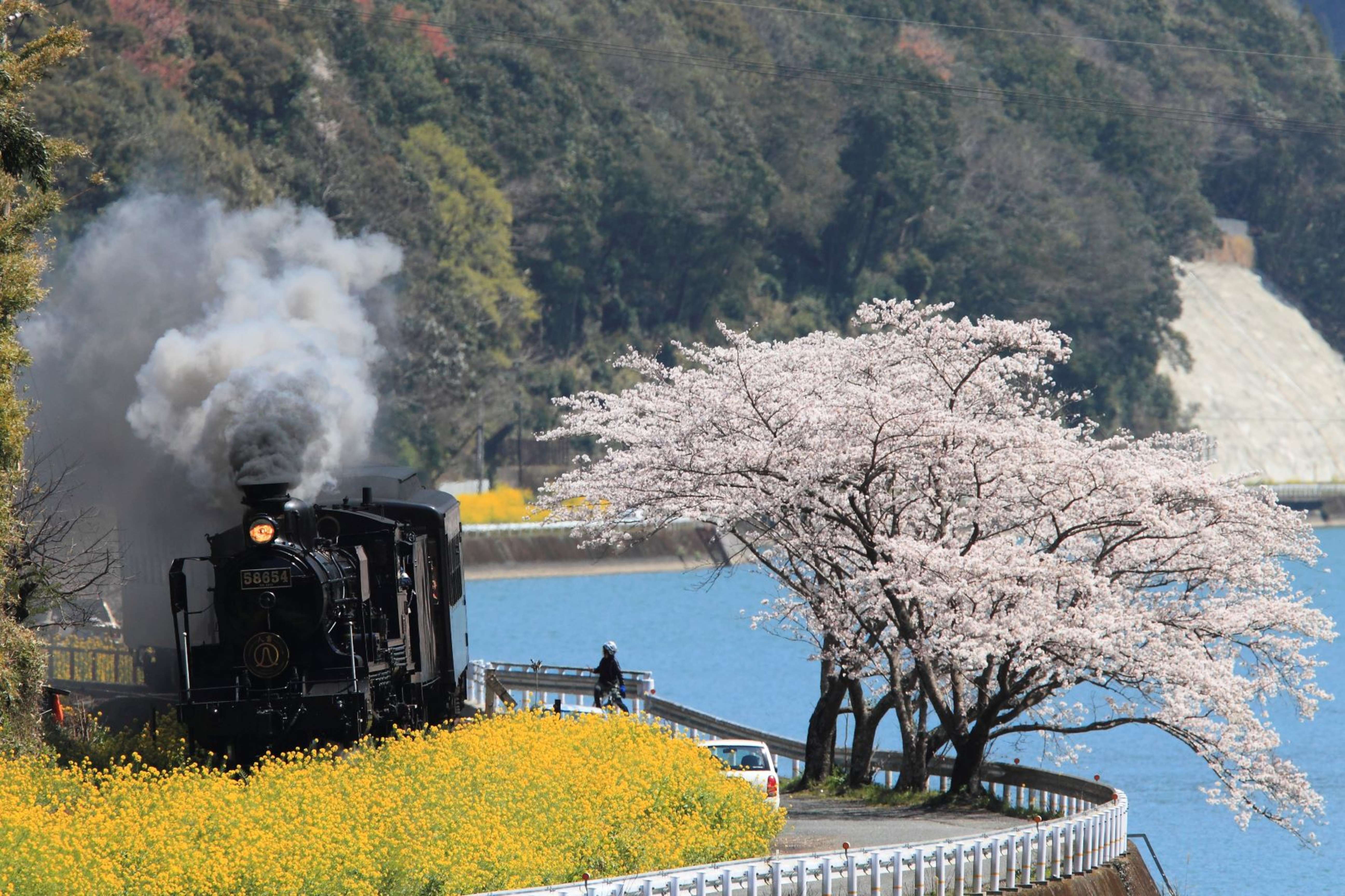 Nous gagnons la gare de Kumamoto où nous attends le train à vapeur du SL Hitoyoshi. L’ambiance est bonne enfant. Aujourd’hui, la plupart des régions possède leur propre train touristique et ils ont toujours beaucoup de succès. Tous ces trains cultivent davantage la nostalgie d’une époque révolue, plutôt que le luxe. Les wagons du SL Hitoyoshi, décorés à l’ancienne, disposent de tout le confort moderne mais de la plus ancienne locomotive à vapeur du Japon ! Elle date de 1922. En queue de train la voiture panoramique permet d’apprécier la vue.