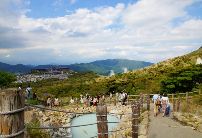 Pour traverser la montagne jusqu'au lac Ashinoko, le funiculaire de Gora et le téléphérique qui y est raccordé offrent le plus beau panorama qui soit sur la splendeur naturelle de Hakone. Sur le chemin qui mène au sommet, le petit train de montagne serpente dans des vallées densément boisées, puis le téléphérique de Hakone vous emmène à travers les montagnes et au-dessus de la vallée d'Owakudani dont les émanations de soufre alimentent les sources d'eau chaude de la région.