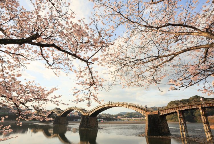 La maçonnerie des piliers qui constituent les fondations du pont Kintaikyo contrastent harmonieusement avec son élégante structure voûtée. Au pied du château d'Iwakuni , le pont Kintaikyo est un superbe exemple d'ingénierie japonaise. Sa beauté se révèle chaque saison sous un nouveau jour.