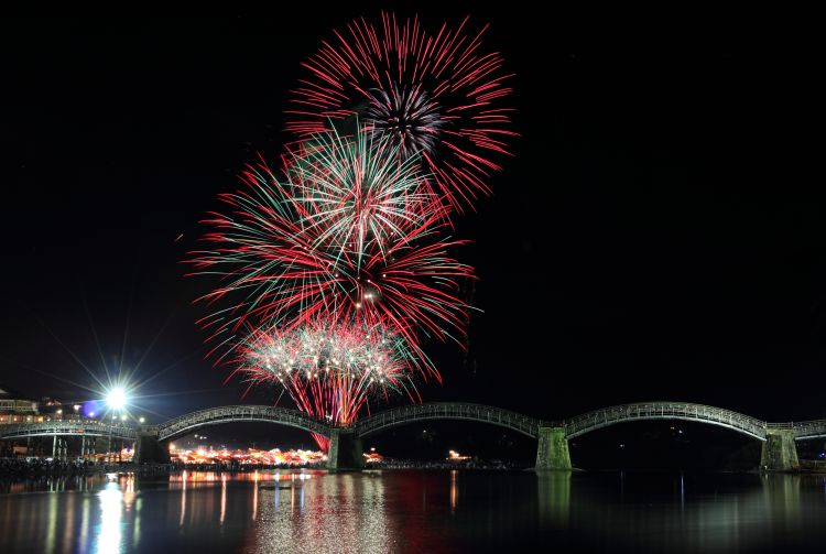 Kintaikyo est particulièrement magnifique en août, lors du festival d'été de feux d'artifice. Cette tradition populaire estivale illumine le pont de somptueuses lueurs.