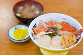 來到中午,差不多是時候吃飯了!這家位於海邊的餐廳主打海鮮丼,和風裝潢的食堂內貼著店長與許多名人的合照,原來是間人氣店!這天我們點了最受歡迎的海鮮丼,上面有帆立貝、海膽、三文魚、蝦和魚子,刺身鮮甜又爽口,超級美味!這價錢和味道在我們居住的大阪市內很難找到呢!寒天下的味噌湯也特別好喝。餐廳還附設出售海產乾貨的商店,我們也買了些乾海帶跟魷魚絲回去做手信!