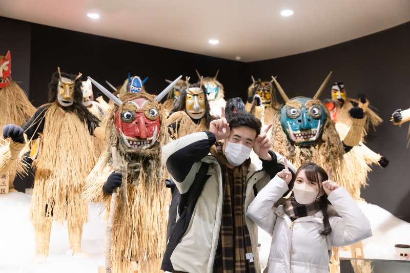 旅程的第一站我們來到生剝鬼館。館內介紹了生剝鬼的由來及現代生剝鬼節舉行的傳統民俗活動。生剝鬼相傳是一種面目猙獰的山神,它會上門向村民討酒喝,並嚇唬家中不聽話的小孩子。小朋友們如果不想生剝鬼來找自己就記得要乖乖聽話了! 生剝鬼傳說現已變成秋田縣男鹿市等地區的習俗,每年除夕夜,村裡的年輕人都會戴上面具,穿起蓑衣和草裙,手持木刀和木桶,扮成生剝鬼的模樣。他們會一邊大聲吼叫,一邊造訪各家各戶。對於小孩子來說有怪物來抓自己確實是很可怕,幸好香港並沒有類似的習俗,不然小時候的我應該會留下陰影!