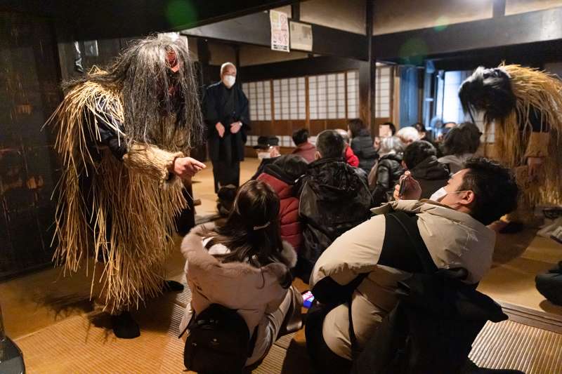 了解完生剝鬼的故事,我們還能在旁邊的男鹿真山傳承館體驗一下生剝鬼的造訪體驗!一進去是一個非常傳統的和式房間,遊客可以坐在榻榻米上,靜候表演開始。生剝鬼登場時動作和聲音都很大,走遍整個房間說要抓走懶惰和不聽話的小孩,表演逼真,連在場的大人們都感到幾分可怕。吵鬧一番之後,屋主為了平息生剝鬼的憤怒,於是請它喝酒並懇求它放過不聽話的小孩,最後生剝鬼答應屋主離開,並揚言明年會再來,要求屋主一家今年必定要好好改過。這表演非常精彩,加上和觀眾的互動也十分有趣,值得一看!
