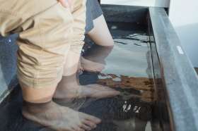 土佐清水市還有一處值得一去的溫泉鄉 — 足摺溫泉,據講對肌肉痛、關節痛等都有顯著療效。在足摺岬一帶走到累了,我們便來到萬次郎足湯好好休息一下。這裏設備完善卻竟然費用全免,室內足浴設施中設有鞋櫃、洗腳池,還有呈階梯式的足浴池,讓旅客無論坐在哪裏,都能同時欣賞窗外的白山洞門美景及浩瀚的太平洋。我們坐在這裏,慢慢看着太陽西沈,談笑風生,寫意無比。