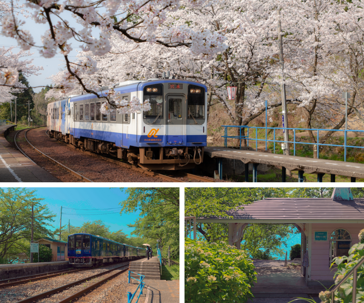 能登鹿島站是能登鐵道的一個無人車站,可以望到七尾灣的美麗海景,是充滿海濱風情的小小秘境車站。每年春天約有100株櫻花沿月台盛開,可以欣賞到絕美的櫻花樹大道。櫻花季期間還會舉辦夜間點燈並掛上提燈,因此有「能登櫻花站」稱號,是石川縣人氣數一數二的賞櫻景點!