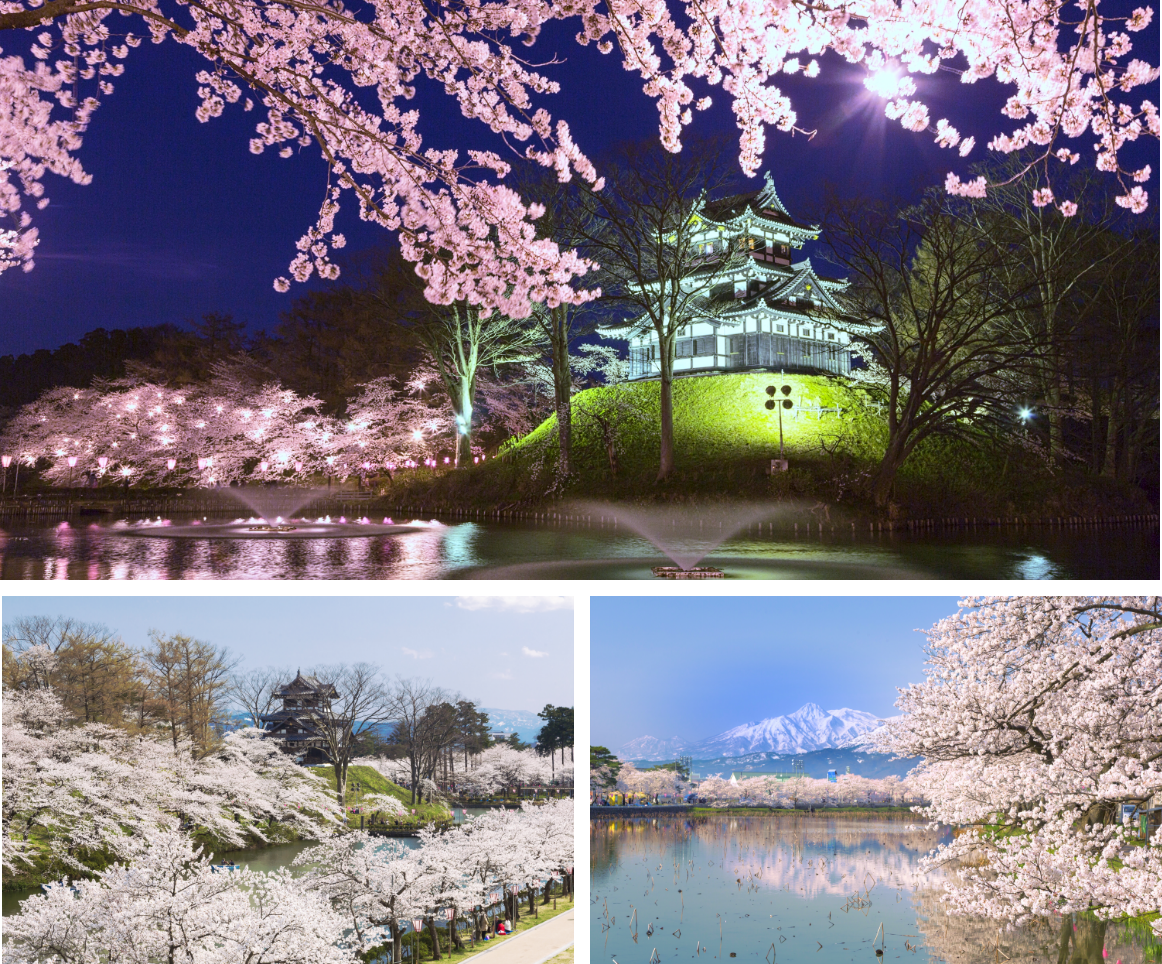 高田城址公園原為江戶時代所建的高田城所在地,因其崇高的歷史價值被列為新潟縣史跡。園內及周邊種植了約4,000棵櫻花樹。每年4月櫻花季的晚上,園內亮起約3,000盞燈籠,夢幻唯美的夜櫻映照於水面上,吸引眾多遊客前來欣賞,是新潟縣數一數二的賞櫻熱點。夏季有蓮花,秋季有紅葉,冬季則搖身一變成為銀白雪景,四季景致都各有特色!