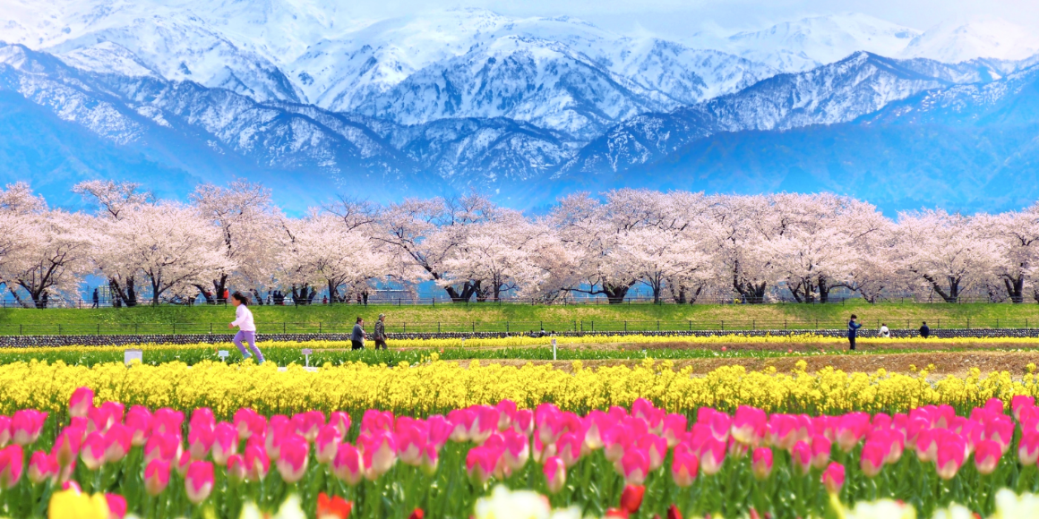 富山縣朝日町的「春之四重奏」位於舟川沿岸,沿著1.2 公里的堤岸種有約280棵的染井吉野櫻。每年大約4月頭至中,與前方油菜花田與鬱金香、後方北阿爾卑斯的朝日岳及白馬岳殘雪同框,形成四層的花海與雪山多重風景,讓人目不暇給,視覺之震撼被譽為限定絕景,春季來到富山就萬勿錯過!