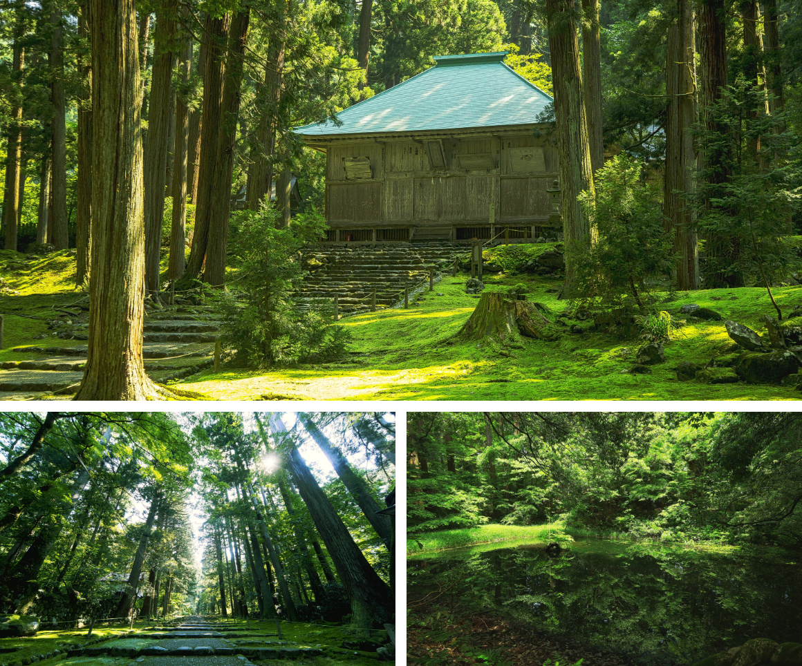 平泉寺白山神社位於福井縣勝山市,充滿歷史的神社內鋪滿天然青苔,宛如綠色絨毯的美景,使其有「苔宮」稱號。境內參道由高聳的杉木包圍,又有以北陸代表河流「九頭龍川」的石頭所砌成的石疊道,漫步在此,可感受到神秘又充滿自然的氣息。