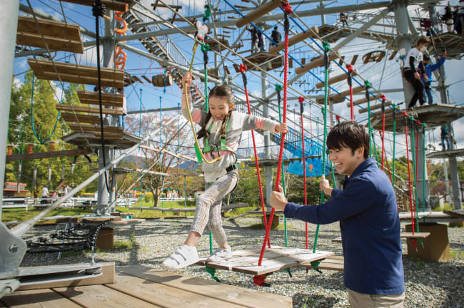 「滋賀農業公園Blume之丘」不單有廣寬的花圃,更有巨型攀登運動遊樂設施「Alps Gym」,72個關卡任你選擇,一點也不小兒科!與孩子同行的話,可以選擇位於1.2米處的兒童路線,穿梭於繩索與木板之中,手腳共用的大冒險定能盡興!想挑戰更高難度的成人版路線,可一直往高空發展,試試高空滑索,甚至在半空踩單車!全程配戴保護裝備,再活躍也不怕受傷, 孩子開心、父母放心。