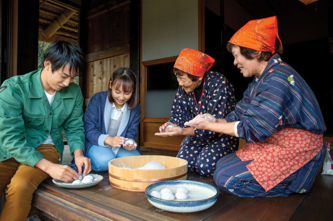 美山村至今仍有村民居住,而且熱情好客。有時間的話不妨探訪當地婆婆,在她們的指導下試試從糯米開始做日本年糕。拿起大搥、隨著節奏揼年糕,叫喊聲與笑聲中看著粉糰逐漸成形,搓圓後蒸熟就可以品嚐親手造的美味!