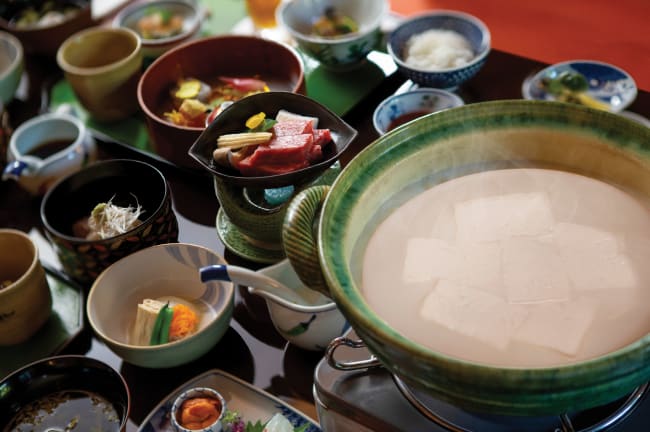 嬉野溫泉既是日本三大美肌之湯,亦以溫泉湯豆腐聞名。當地的湯豆腐以溫泉水入饌,豆腐泡入溫泉後隨熱力慢慢融化,去除稜角後更軟滑可口,溫泉水湯底亦變成白潤的豆乳鍋。相傳自江戶時代,這道溫泉湯豆腐已是當地溫泉旅館的早餐必備菜式。建議先沾芝麻醬,再按喜好蘸點柚子醋、豉油及 各種藥味伴料,最後可加入白飯、雞蛋和紫菜做成雜炊煮,享受湯豆腐的每分精華。