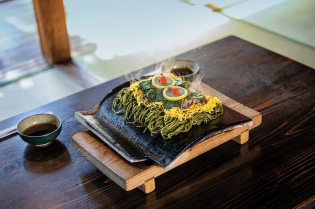 現在雖然毋須靠瓦片煮食,但瓦片確有保溫性,且能為蕎麥麵添上一份焦香。瓦片蕎麥麵看似簡單,其實用料相當講究,以茶香蕎麥濃的「茶蕎麥麵」為主軸,加上牛肉、錦絲雞蛋和紫菜,再配上辣蘿蔔蓉、檸檬等伴料,沾麵汁食用。先蘸麵汁嚐嚐麵條原味,再加入伴料,最後不忘享用底部焦香的麵條,一次過享受幾種口感。