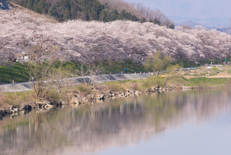穿過公園橫跨鐵軌的橋,迎面而來的是河畔幾乎無邊無際的爛漫櫻花。這就是著名「白石川堤一目千本櫻」的起點之一。
