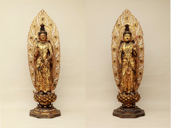 (L) "Nikko Bosatsu (Sūryaprabha)", Kamakura Period (13th century), Saimyoji Temple, Shiga. "Gakko Bosatsu (Candraprabha)", Kamakura Period (13th century), Saimyoji Temple, Shiga. (R) TANE Tsuyoshi, "Estonian National Museum", 2006-16 © Takuji Shimmura | Image courtesy of DGT.