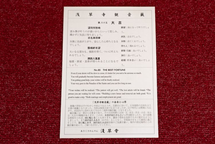 Passa davanti agli occhi vigili di Fujin e Raijin e scivola sotto la lanterna gigante della Kaminarimon per arrivare dritto al cuore della Strada Nakamise-dori. Negozi ricchi di souvenir unici e snack tradizionali costeggiano la via. Entrando nell'area del tempio, troverai i caratteristici omikuji, oracoli scritti anche in inglese. Esprimi un desiderio e buona fortuna!