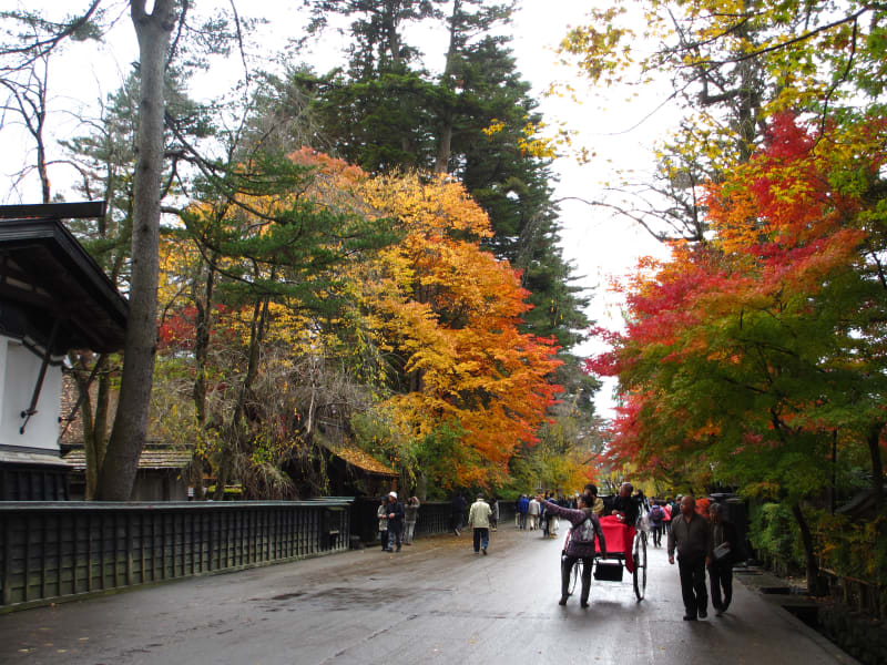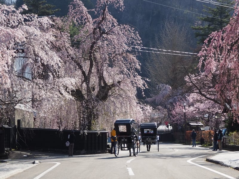 봄이 되면 무사 저택 옆을 흐르는 히노키나이강 둑 위로 400그루가 넘는 벚나무가 가지를 늘어뜨리고, 만개한 벚꽃 터널 사이로 보이는 무사 저택이 한층 더 일본다운 풍경을 연출합니다. 벚꽃 외에도 여름에는 녹음을, 가을에는 단풍을 즐길 수 있으며 겨울에는 하얀 눈이 거리를 소복하게 덮어 1년 내내 멋진 풍경 속을 누빌 수 있어 사시사철 방문하기 좋은 일본 여행지입니다.