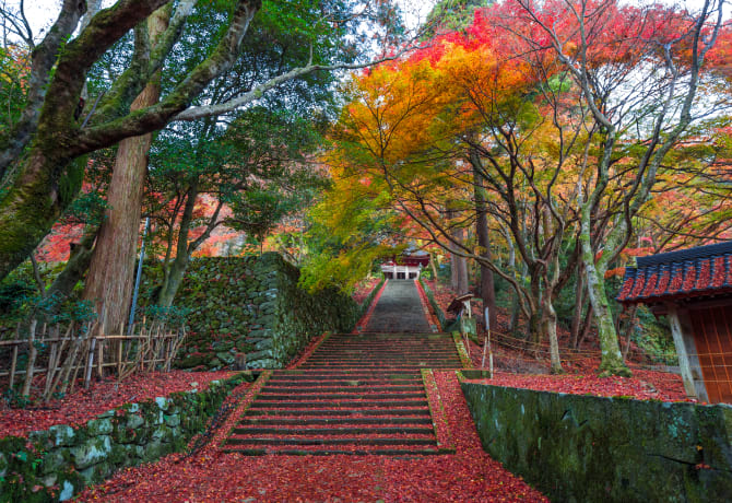 가쿠엔지 사원은 이즈모 타이샤 신사 위의 푸르른 언덕에 자리 잡은 사찰로, 이곳에 얽힌 전설로 유명합니다. 부지를 걸어서 둘러보며 폭포를 찾아보세요. 이 폭포 앞에서 전설적인 무사 벤케이가 수행을 했다고 합니다. 이 이야기는 대를 이어 전해 내려오고 있습니다. 매년 11월이면 그를 기리기 위한 가쿠엔지 사원 가을 단풍 축제가 열립니다. 가을에는 특히 더 아름다운 경치를 감상할 수 있습니다.