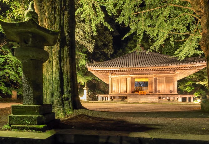 800년 이상 된 수수한 목재 건물로 후키노토 료칸 뒤편의 고요한 숲속에 자리하고 있으며, 규슈에서 가장 오래된 건물이자 국보이기도 합니다. 간결하지만 격조 있는 건물은 사람 몇 명만 앉을 수 있는 크기로 보통 매우 조용합니다. 육두구 나무 한 그루로 깎았다는 아미다 부처상을 모신 내부와 주변의 고요한 정적을 시간을 들여 찬찬히 감상해보세요.