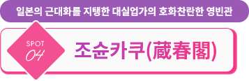 시바타시 출신의 오쿠라 기하치로(大倉喜八郎, 1832~1928)는 1대에 오쿠라재벌을 만들어내어 근대 일본의 발전에 크게 기여한 대실업가입니다. 오쿠라의 별저였던 ‘조슌카쿠’는 원래 도쿄에 있어 정계, 경제계 거물들과 국내외 귀빈들을 접대하기 위한 영빈관으로 사용되었습니다. 2022년에 (공재) 오쿠라 문화재단에서 시바타시에 기증되었고, 2023년부터 일반에 공개되고 있습니다. 외관은 일본 스타일인데 내부는 샹들리에와 의자가 배치된 서양스타일입니다. 1층의 가노파 화가에 의한 후스마에(맹장지에 그린 그림)와 2층의 대리석 모자이크 장식과 아름답고 독특한 천장은 꼭 구경하세요