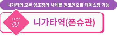 2024년 봄에 ‘니가타현 버스 터미널’이 새로 탄생하고, 역빌딩 ‘CoCoLo 니가타’도 리뉴얼 오픈. 니가타역 주변은 지금 핫 스폿이 되었습니다. CoCoLo 니가타에는 음식점이나 니가타현을 대표하는 과자, 쌀과자, 술제조업체 직영점이 모여 있으며, 특히 주목할 만한 곳이 니가타현에 있는 89곳의 양조장의 사케를 원코인으로 테이스팅할 수 있는 ‘폰슈관’. 사케를 좋아하시는 분들엔 빼놓을 수 없는 스폿입니다. 또한 역 앞에는 ‘NIIGATA’의 로고 오브제도 있어 기념촬영을 추천합니다.