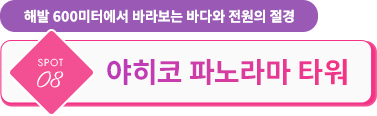 야히코신사 뒤에서 로프웨이를 타고 크라이밍카로 밑으로 내려가면 야히코 파노라마 타워 입구가 있습니다. 야히코산 정상 가까이에 서있는 이 파노라마 타워는 약 8분간 왕복하는 일본에서도 드문 회전승강전망탑이며 전망실이 가장 높은 지점은 해발 약600미터가 됩니다. 날씨가 좋으면 바다와 에치고 평야의 논 풍경을 바라볼 수 있어서 기분이 상쾌해집니다. 로프웨이 및 정상역의 전망도 훌륭합니다.