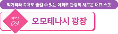 ‘오모테나시 광장’은 야히코역에서 도보 5분, 야히코 신사에서도 도보 10분 거리에 있으며 야히코 산책 중에 휴식하기에 딱 좋은 곳입니다. 푸드코트의 인기메뉴는 ‘나고미야’의 ‘가이호돈’. 야히코무라에서 생산되는 특별재배쌀 ‘이야히코쌀’ 위에 신선한 연어알, 가리비, 성게를 얹은 회덮밥입니다. 또한 ‘야히코 스위츠’의 ‘컬러플 단고’도 포토제닉해서 추천합니다. 야히코유 신사온천의 원천에 그대로 들어갈 수 있는 족탕, 손탕으로 여행에서 쌓인 피로를 회복할 수 있습니다.