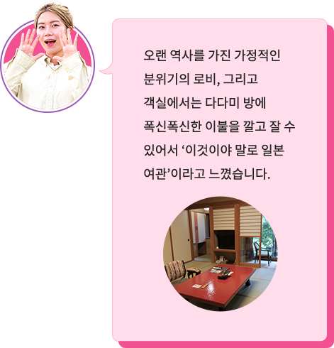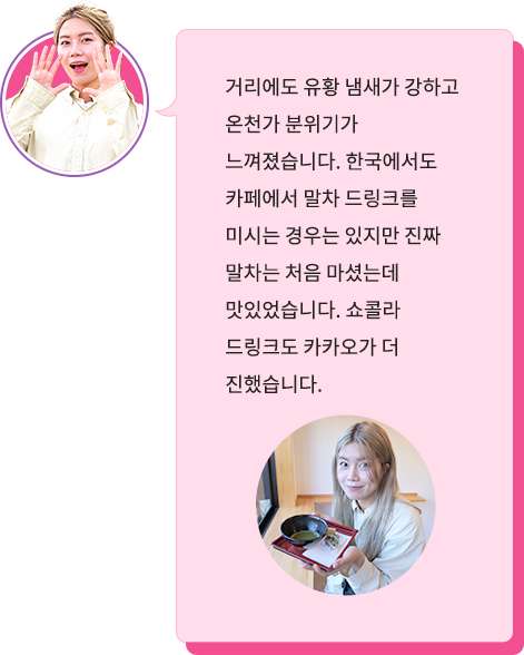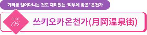 ‘피부에 좋은 온천’으로 알려진 쓰키오카온천은 일본에서 가장 많은 함유율을 자랑하는 유황천으로 입욕제로 착각할 정도로 아름다운 에머랄드그린의 물 색깔이 특징입니다. 이 온천가에서는 거리를 걸어다니는 것도 하나의 재미입니다. 예를 들어 ‘니가타 단맛 premium WAGASHI NAGOMI’에서 직접 만든 말차와 일본 전통과자를 즐기며 ‘니가타 쇼콜라 premium SWEET AMAMI’에서 산 쇼콜라 드링크를 들고 메인스트리트를 여유롭게 산책하는 등 각자 자유롭게 보낼 수 있습니다.