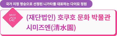 시미즈엔은 에도시대 초기인 1658년에 시바타(新発田) 번주 미조구치(溝口)씨가 별저에 만든 정원입니다. 연못 주위에는 간소한 다실풍건물 양식의 서원과 5가지의 다실이 있으며, 서원으로부터는 옛날 다이묘들이 바라봤던 시선처럼 연못에 비추는 식물의 모습을 바라볼 수 있습니다. 현재는 국가 지정 명승으로 시바타를 대표하는 관광 명소 중 하나가 되어 있습니다. 계절마다 그 모습을 바꿔가며 시바타를 사랑한 번주의 마음이 느껴지는, 니가타 이북 지역에서는 유례가 없는 명정원이라는 평을 받고 있습니다.