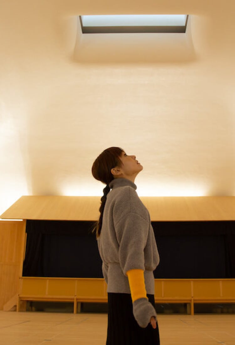 안으로 들어가면, 노송나무의 상쾌한 향기가 납니다. 홀내 중앙 오두막집은 가가와 현 무형유형민속문화재로 지정된 나오시마 분라쿠 무대. 희고 둥그스름한 홀 천장에는 일본의 전통적인 가옥으로 사용되는 ‘싯쿠이(漆喰)’라고 하는 석회질 소재가 있습니다. 천장에 네모난 구멍이 있는데 무엇일까요?